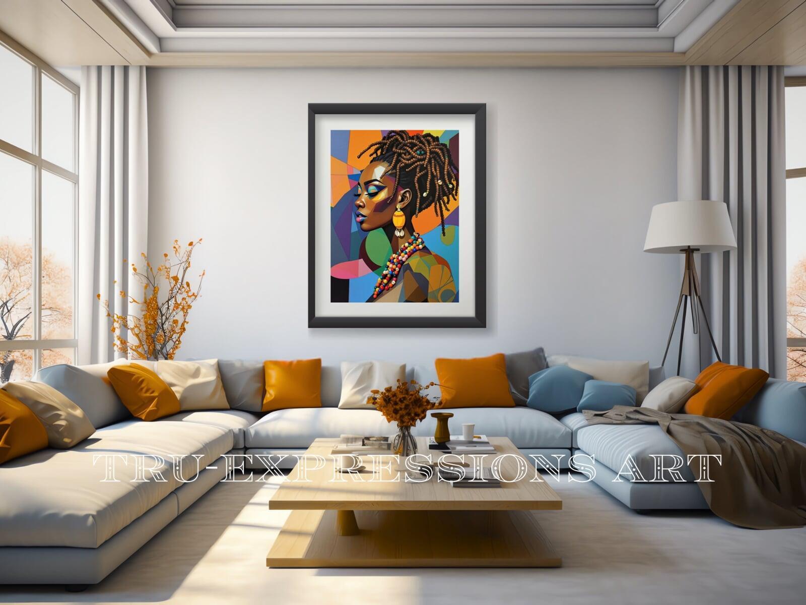 To bring this look into your own home, view the 'Mosaic of Strength - Vibrant Geometric Art Print (UNFRAMED)' in our collection: https://www.tru-expressions.co.za/products/g6e1b382c0/6323327000000440102