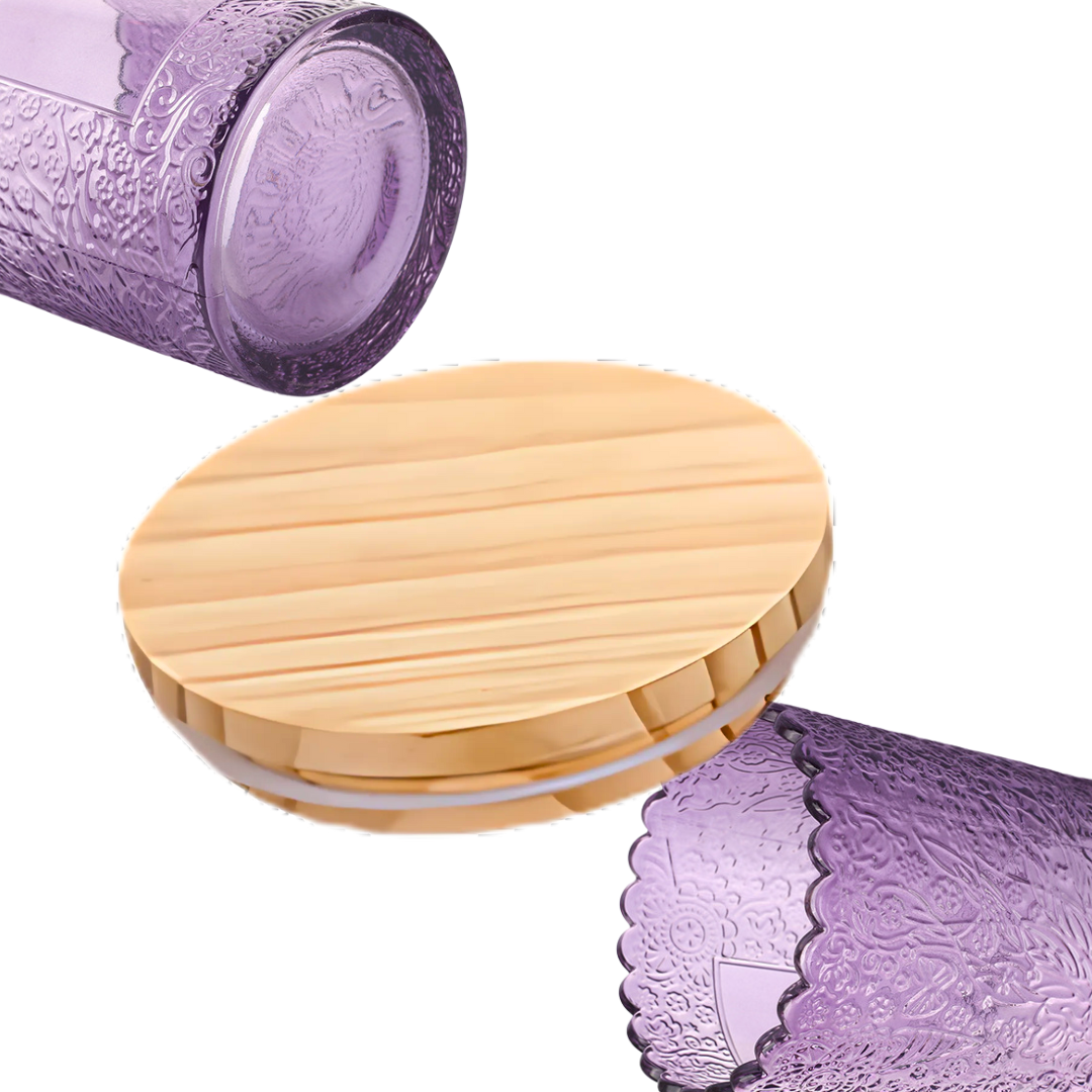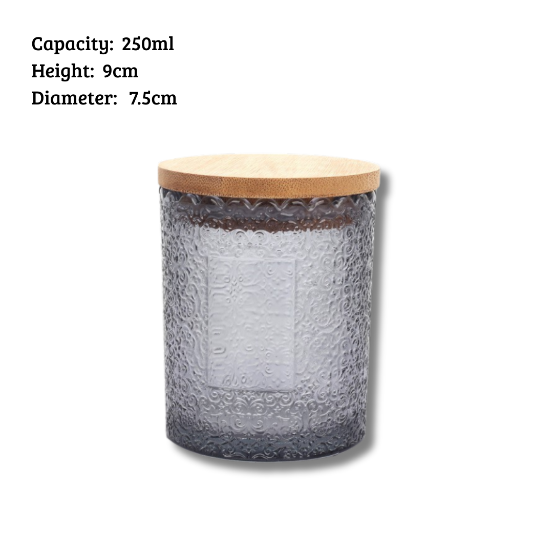 Elevate your candle-making projects, home decor, or gift packaging with these 250ml patterned glass jars, beautifully crafted with intricate embossed textures and topped with an eco-friendly bamboo lid. Available in four eye-catching colors — Gray, Yellow, Red, and Purple — these jars bring a stylish and sophisticated touch to any setting.