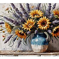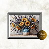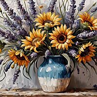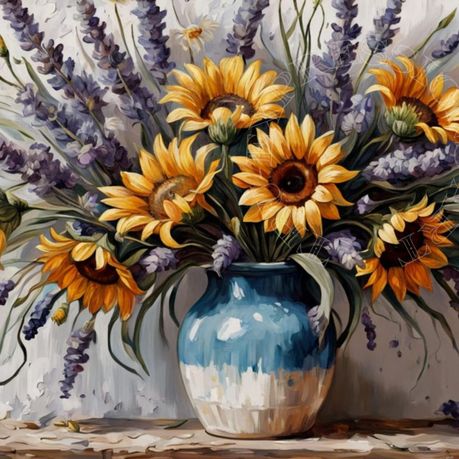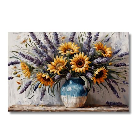 Bring a splash of sunshine into your home with this printable Sunflowers & Lavender Bouquet art piece. Created in a rich oil painting style, this digital wall art features vibrant sunflowers and fragrant lavender in a rustic ceramic vase, arranged against a weathered backdrop for vintage charm. Perfect for lovers of cottagecore and farmhouse style, this botanical artwork evokes warmth, serenity, and countryside beauty.