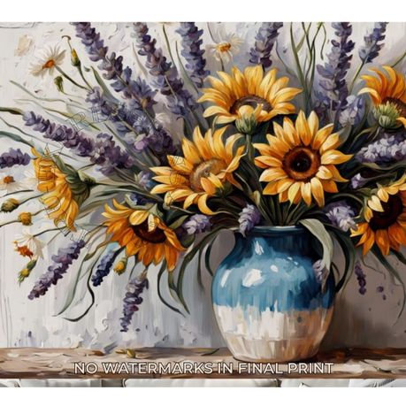 - Charming Sunflowers & Lavender Art: Brighten your space with this delightful canvas print, featuring a vibrant bouquet of sunflowers and lavender in a rustic vase, rendered in a rich oil painting style.