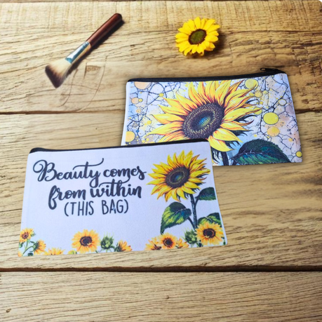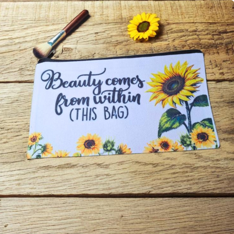 Keep your essentials beautifully organized with this charming sunflower-themed canvas zipper pouch, designed to inspire and delight. One side showcases the uplifting quote “Beauty Comes From Within (This Bag)”, while the other features a radiant sunflower print – a perfect blend of function and positivity.