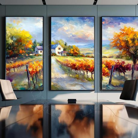Immerse your home in the warm glow of the countryside with this breathtaking Vineyard Landscape Triptych art print set. Featuring three complementary panels, this collection captures the vibrant beauty of an autumn vineyard, rendered in a rich, textured impasto style. With golden foliage, distant farmhouses, and rolling hills under a soft sky, these prints evoke the serene charm of a Tuscan landscape. It's the perfect fall decor to create a stunning gallery wall set in your dining room, kitchen, living area, or wine cellar.